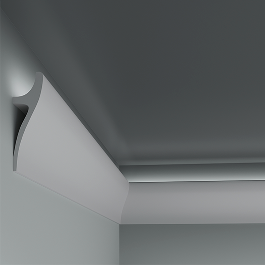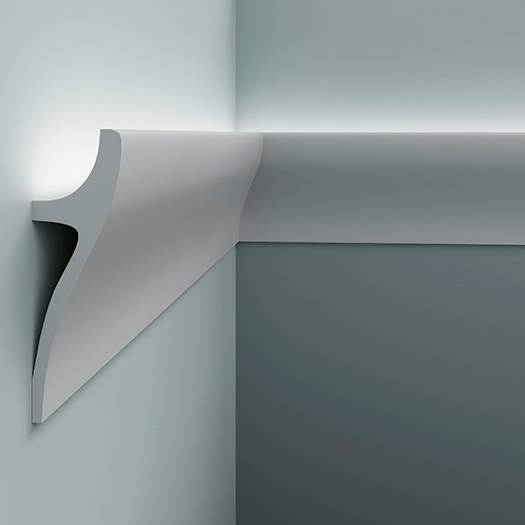У полиуретанового плинтуса 1.51.711 с LED-подсветкой имеется строительная фольга, приклеенная к изнаночной стороне. Это необходимо для правильного и равномерного рассеивания света.