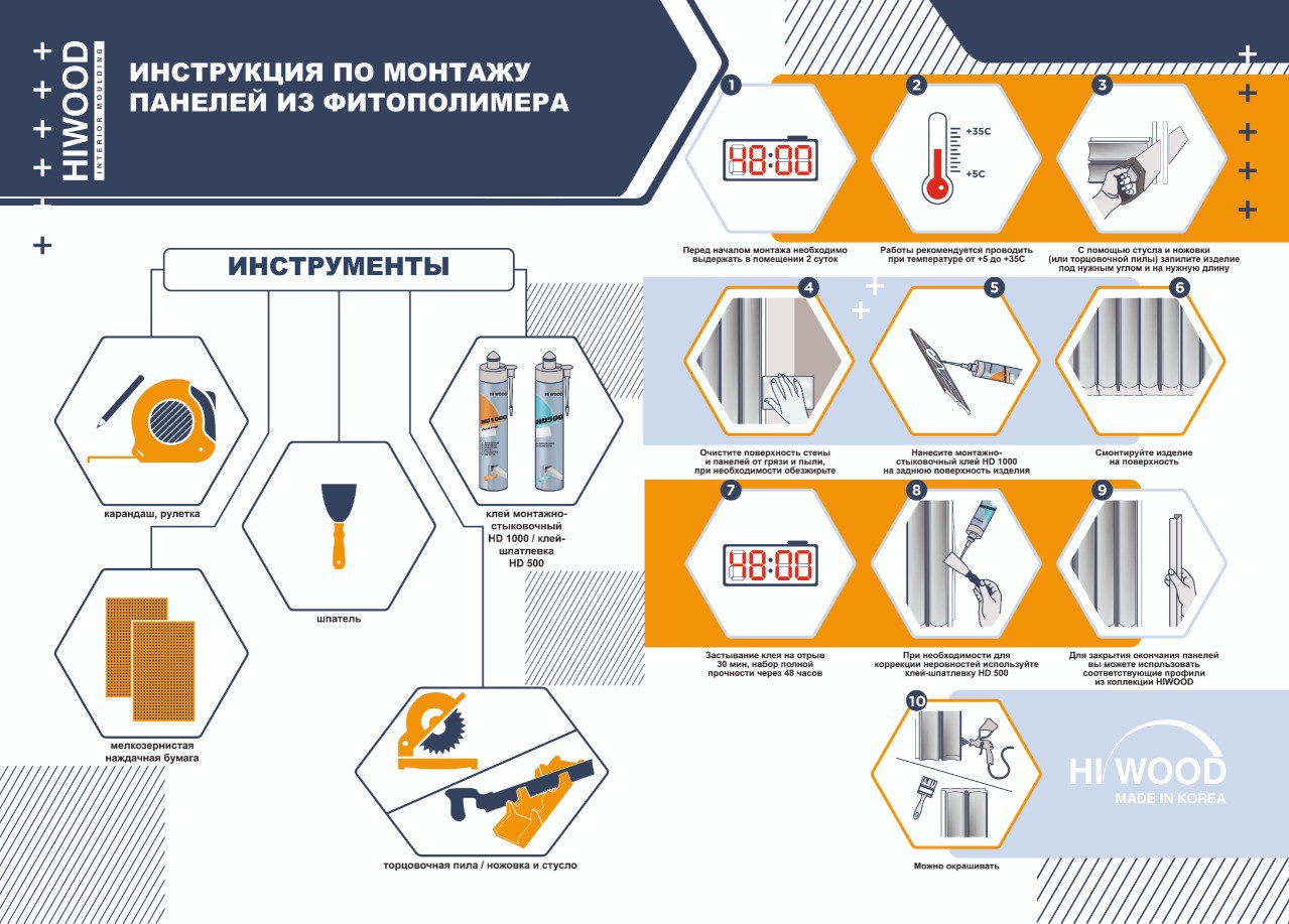 Панель изготовляется из фитополимерного материала от южнокорейского производителя HIWOOD, отличается своей экологичностью, ударопрочностью и плотной структурой, что делает её устойчивой к влаге и износу.