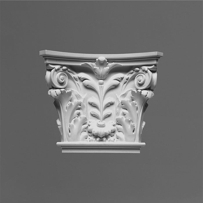 Коринфская капитель пилястры K251, декорированная листьями аканта и волютами, выполнена из полиуретана высокого европейского качества, соответствующего всем нормам экологической безопасности. Верхним слоем элемента является ультратонкая полиуретановая пленка (грунтовка), составляющая с ним единое целое, поэтому капитель может быть окрашена любыми качественными красками.