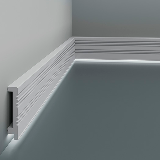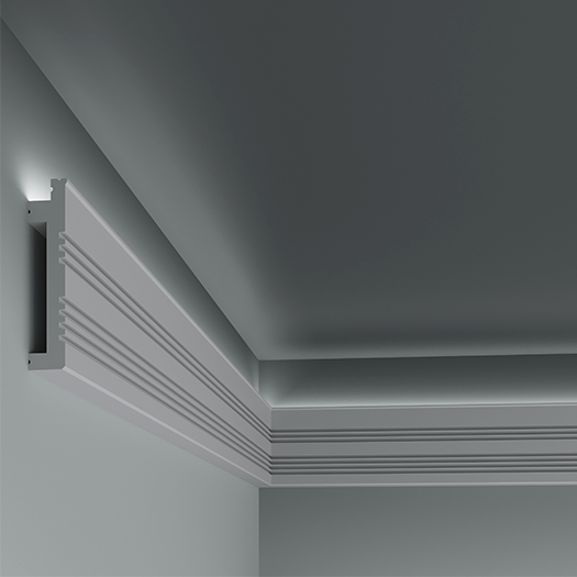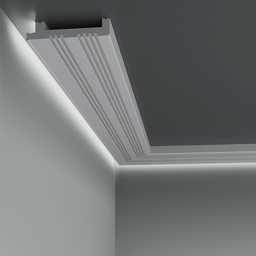 У карниза с LED-подсветкой имеется строительная фольга, приклеенная к изнаночной стороне. Это необходимо для правильного и равномерного рассеивания света.